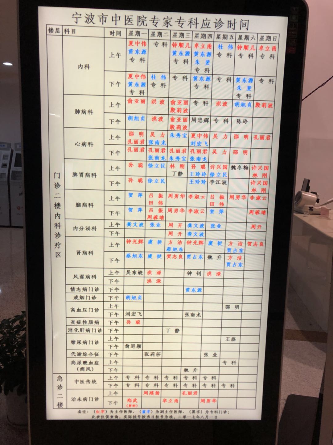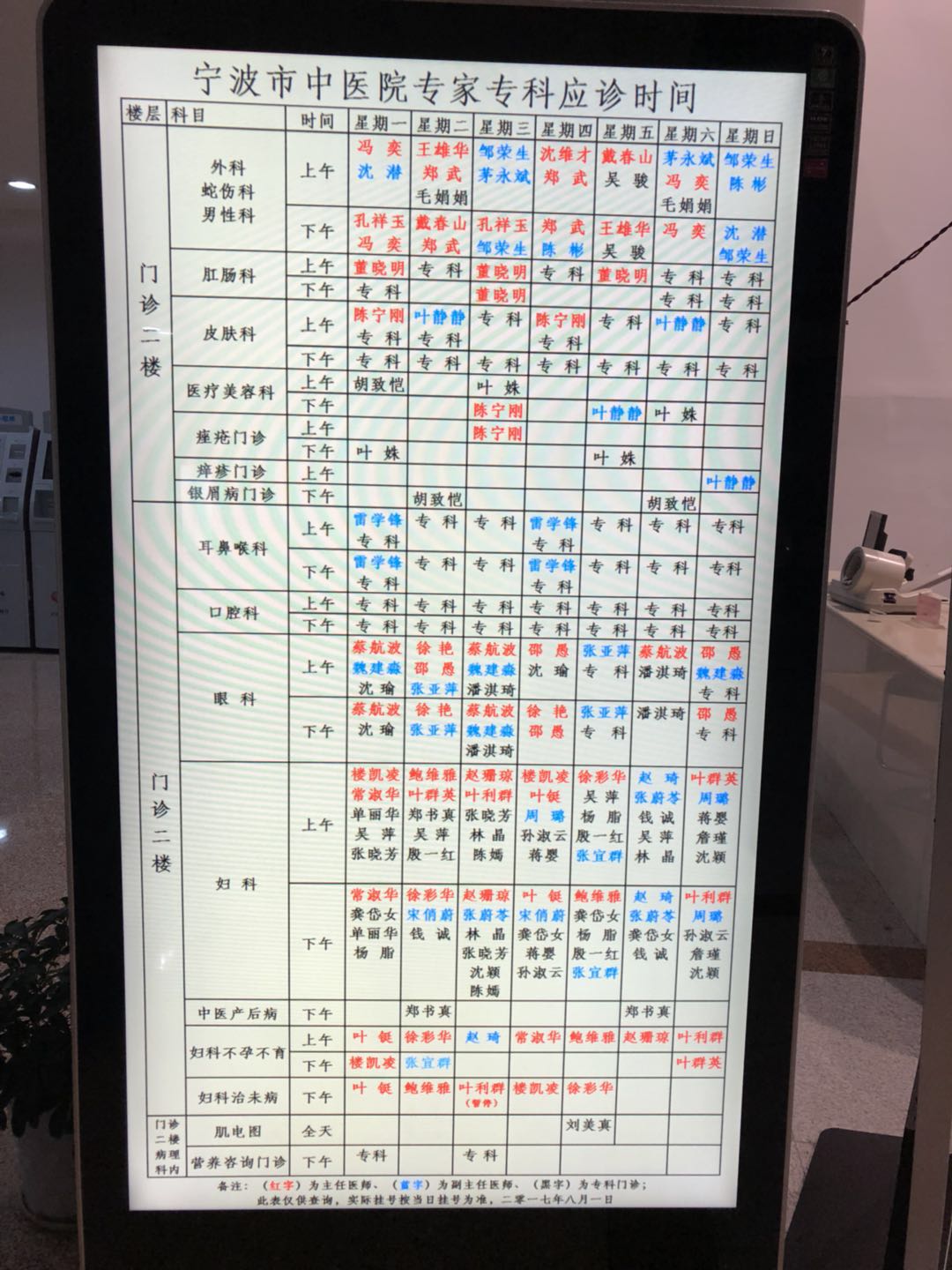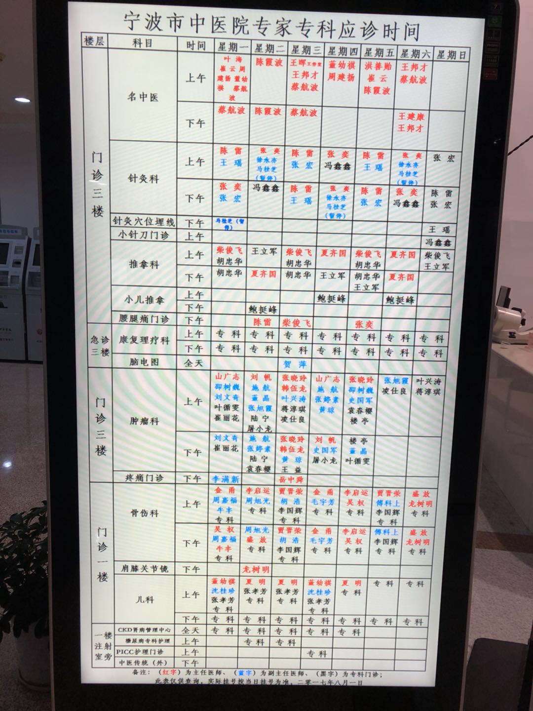 2017年11月中医院门诊及专家出诊时间表