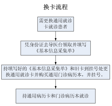 (2)已持有项目实施医院发的就诊卡的患者,可在就诊时凭有效身份证件和以前的就诊卡,到各项目实施医院挂号处免费更换一张通用就诊卡,但通用病历本不能更换,需重新购买。