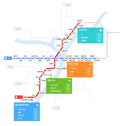2号线一期工程是城市西南-东北方向的骨干线路,途经鄞州、海曙、江北、镇海四个行政区,串联了栎社机场、段塘客运中心站、宁波火车站、三江片商业中心、汽车市场、宁波大学等交通枢纽、大型客流集散点和北高教园区。工程线路全长28.35km,设车站22座。其中地下站18座,高架站4座。工程已于2010年12月开工建设,计划今年底通车试运营。